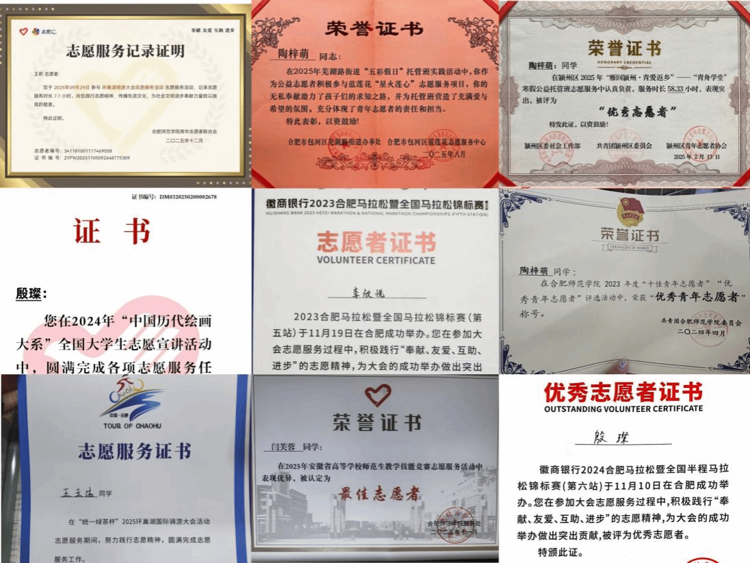 志愿服务的付出,也收获了诸多荣誉肯定。毕新茹在安徽省高等学校师范生教学技能竞赛志愿服务中获评“最佳志愿者”;苗晓玲以77小时的沁心湖志愿服务时长展现坚守初心;陈传敏、殷璨等多名同学凭借突出表现斩获“优秀志愿者”称号;陶梓萌在“五彩假日”托管班、“星火莲心”等多个志愿项目中累计服务超60小时,王莉池在“青舟学堂”寒假托管班以58.33小时的尽责服务获评优秀,一张张证书成为志愿路上最闪耀的勋章。